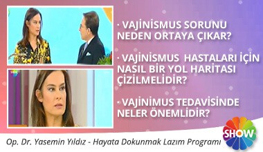 Vajinismus nedir? Vajinismus tedavisi ile ilgili Show TV, Hayata Dokunmak Lazım programında Ebru Akel ve Osman Müftüoğlu’nun konuğu Op. Dr. Yasemin Yıldız Vajinismus konusunda bilgiler vermiştir.